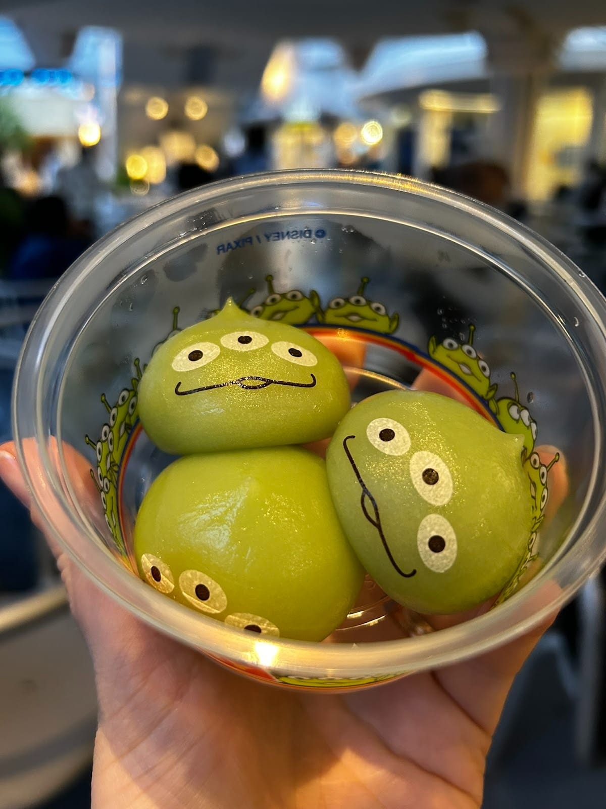 Tokyo Disney is famous for its unique snacks, and we made sure to try as many as possible! A clear family favorite was the Alien Mochi Dumplings—adorably shaped like the Little Green Men from Toy Story and filled with delicious flavors. The best part? They were so affordable that we found ourselves getting them multiple times throughout our trip.