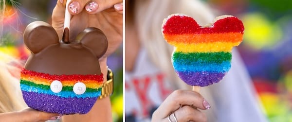- Rainbow Mickey Apple: Granny smith apple dipped in caramel and milk chocolate decorated with two marshmallow ears, red, orange, yellow, green, blue, purple sanding sugars, and white M&M’S chocolate candies (New).