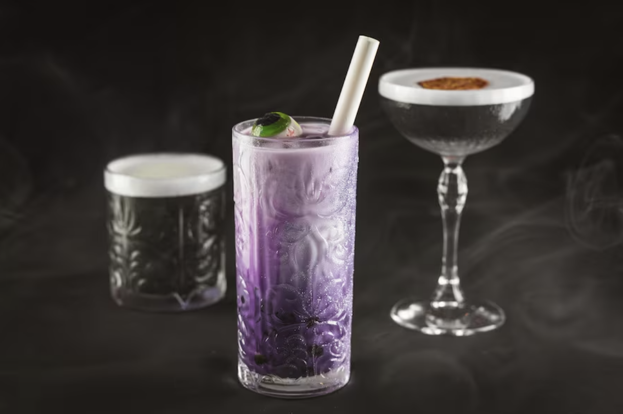 - Ghoulish Delight: For those with a sweet tooth, this potion combines ube fudge, oat milk, tapioca pearls, and a gummy eyeball, all in a glittery purple concoction.