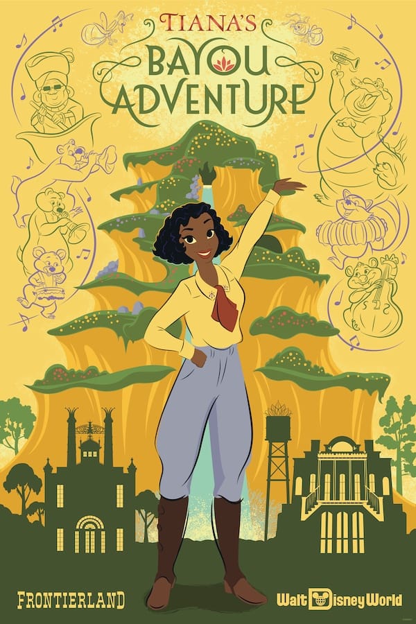 As you journey through the attraction, encounter these beloved critters as Audio-Animatronics figures, immersing yourself in their whimsical performances. And don't miss the chance to spot them on the Walt Disney World attraction poster, capturing the excitement and magic of Tiana's Bayou Adventure.
